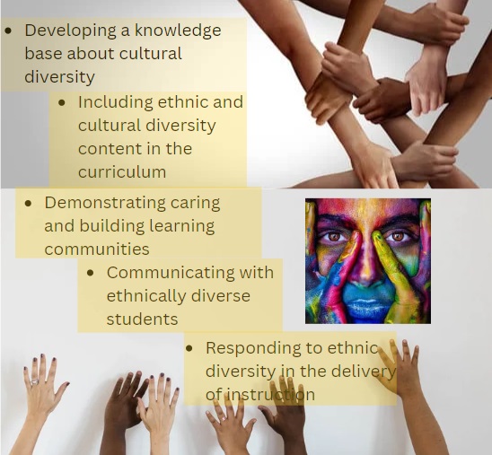 Culturally responsive teaching is a means of creating connections between students and educators, and of improving the quality of education for all students by placing an emphasis on meeting students where they exist in terms of their cultural experiences. This method combines traditional methods of pedagogy with the personal ways in which students have learned within their cultures. This sometimes means stepping away from our idea of what we’ve learned about education and being willing to open ourselves to new ways of teaching and relating to our students. Specifically, in the article “Preparing for Culturally Responsive Teaching” by Geneva Gay, the concept is elaborated. “Culturally responsive teaching is defined as using the cultural characteristics, experiences, and perspectives of ethnically diverse students as conduits for teaching them more effectively” (2002). In this article, Gay defines five elements of culturally responsive teaching: